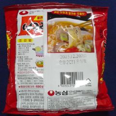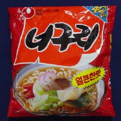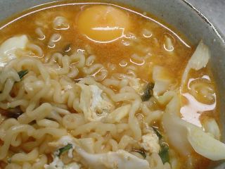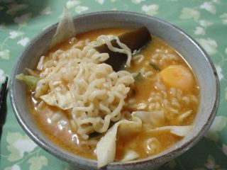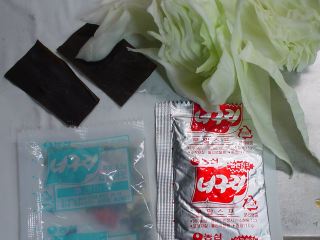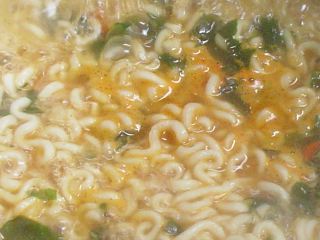 丸い麺と粉末スープ、フレーク、昆布を入れて、