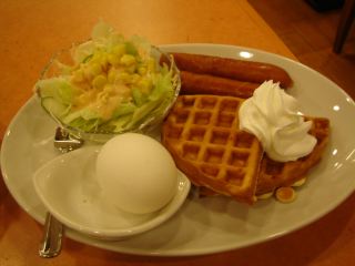 しばらくすると、ごらんのようなワッフル&ソーセージが、