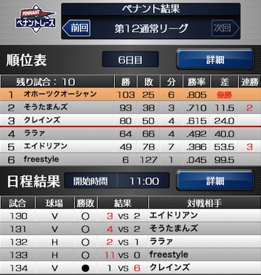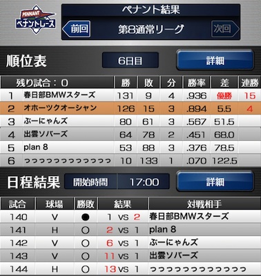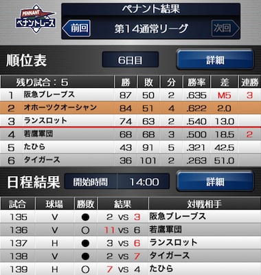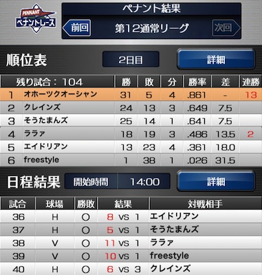 残り5試合でついに逆転されました。この5試合も2勝3敗です。結局2位で終了しました(最終結果画像なし)。