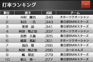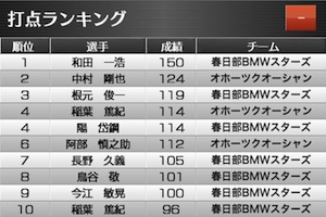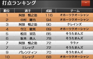 個人打撃成績です。首位打者は我がオホーツクオーシャンの中村剛也(.348)でした。4位に阿部(.337)、6位に稲葉(.301)が入っています。優勝した春日部BMWスターズからは6人もベストテンに入っています。ホームラン王も中村(35本)で、3位に阿部(29本)が入っています。打点王は春日部の和田(150)でした。中村は124打点で2位となり、惜しくも三冠王は逃しました。4位に稲葉(114)、6位に阿部(112)が入りました。