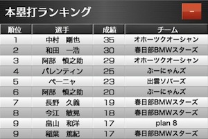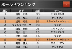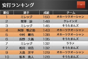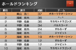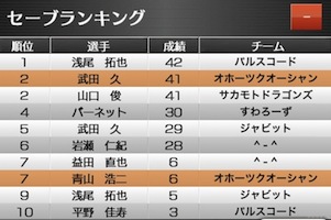 ホールドランキングでは青山が37ホールドでトップでした。セットアッパーへの抜擢が成功しました。また13勝の浅尾も19ホールドで7位に入りました。セーブランキングではパルスコードの浅尾が42セーブでトップでした。オホーツクオーシャンの武田久が2位、青山は7位でした。