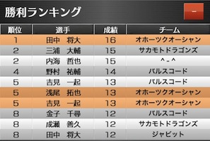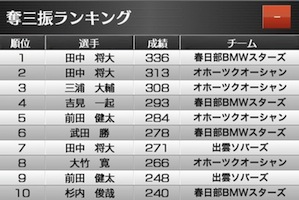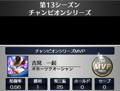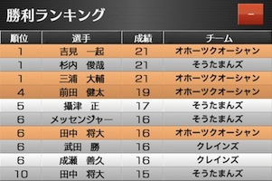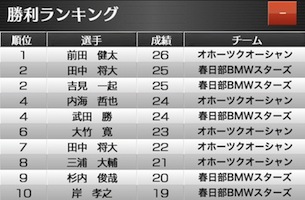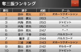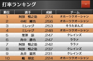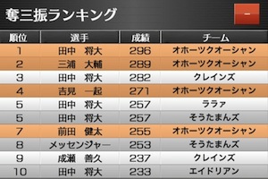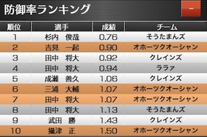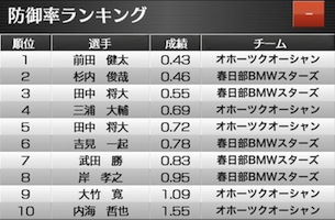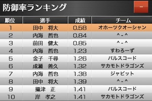防御率は我がオホーツクオーシャンの田中が0.58で獲得しました。最多勝も田中が16勝で獲得し、5位に吉見と浅尾が入りました。浅尾は中継ぎで13勝と大健闘でした。浅尾がいなければ優勝できなかったかも知れません。MVPの候補ですね。奪三振王もやはり田中が271個で獲得しました。8位に三浦が入りました。