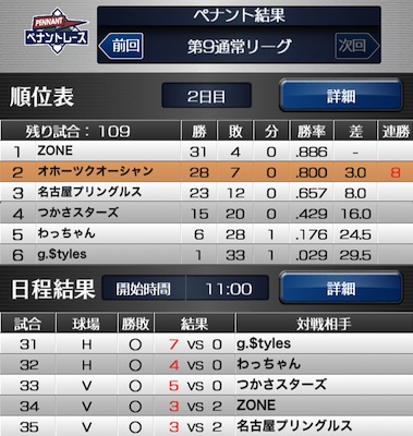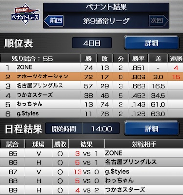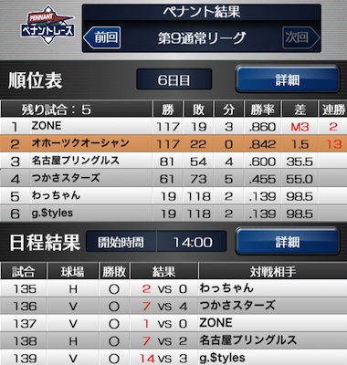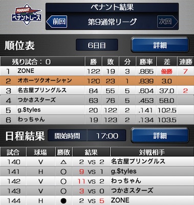 15連勝で首位のZONEを必死に追っています。その差は3ゲーム差。