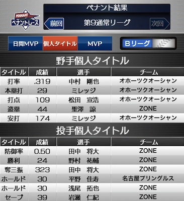 個人タイトルは、首位打者は中村剛也(.319)、ホームラン王はミレッジ(29本)、打点王は松田宣浩(109)と我がチームの選手が獲得しました。最多安打もミレッジでした。投手部門はZONEの独擅場でした。打のオホーツクオーシャン、投のZONEという構図でした。
