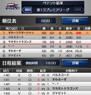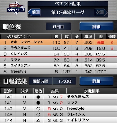 プレミアリーグならではの際どい戦いになりましたが、オホーツクオーシャンは83勝52敗9分の勝率.615となり優勝しました。2位のパルスコードとはわずか3ゲーム差でした。今までの漫画的な勝率ではなく、1位から6位までもが実際にありそうな勝率でした。