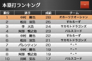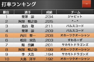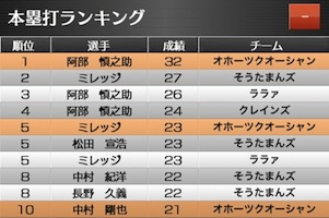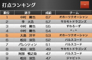 プレミアリーグは超のつく投高打低でした。首位打者はジャビットの聖澤ですが、わずか.234でした。オホーツクオーシャンからは5位に内川、8位に阿部、10位に大島が入りましたが、内川選手だけが2割を超えただけでした。1点の重みの大きい試合が続いたことが推測されます。ホームラン王はオホーツクオーシャンの中村が28本で獲得しました。打点王も中村が67点で獲得し、大島が5位に入りました。