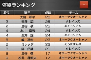 盗塁王は大島 (26)が獲得し、6位に嶋、9位に鳥谷と松井が入りました。最多安打はミレッジ(150)がトップで、4位に三冠王の阿部、5位に中村、9位に大島でした。