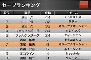 ホールドランキングでは、そうたまんズの浅尾が36ホールドでトップ。我がオホーツクオーシャンの浅尾は32ホールドで3位でした。8位に岸田が入りました。セーブランキングでは、そうたまんズの武田久が44セーブでトップ。我がオホーツクオーシャンの武田久は35セーブで3位でした。7位に浅尾が入りました。