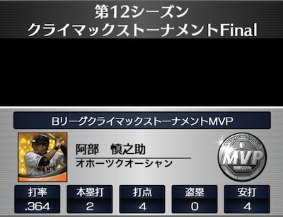 クライマックスシリーズを勝ち上がったそうたまんズとのクライマックスFinalではMVPの杉内投手を打ち崩し、見事3連勝でアドバンテージを加えて4勝0敗となり、チャンピオンシリーズに進みました。このFinalのMVPには三冠王の阿部選手が選ばれました。打率.364、2本塁打、4打点でした。
