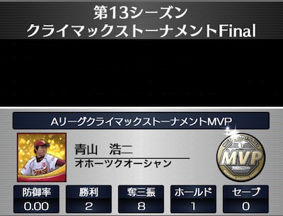 クライマックスシリーズを勝ち上がったペナント2位のパルスコードとクライマックスFinalを戦い、アドバンテージを含めて4勝1敗で優勝しました。FinalのMVPにはセットアッパーの青山が選ばれました。