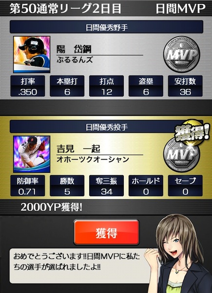 第50通常リーグです。2日目に吉見一起投手が日間MVPを獲得しました。5勝で防御率0.71、34奪三振と完璧な投球です。この調子でチーム一丸となって頑張って欲しいものです。