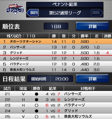 第49通常リーグは、久々に好調で、25試合時点で16勝9敗の勝率.640で2位につけています。