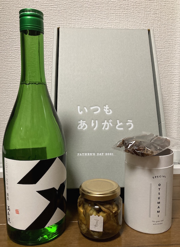 純米大吟醸の日本酒とそれに合うホタルイカと牡蠣のオイル漬けです。