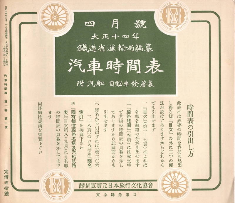 こちらはJTB時刻表の創刊号とされる、大正14年4月号の「汽車時間表」です。