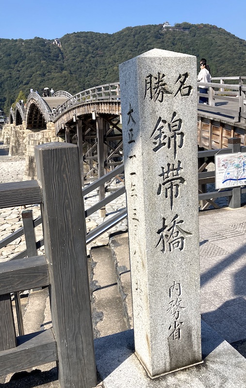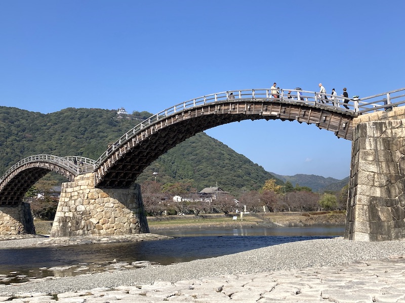 錦帯橋の向こうの山の頂には岩国城が小さく見えます。