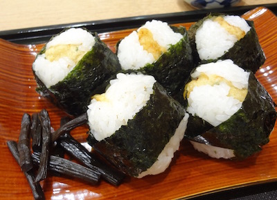 すぐに出てきた天むすは、出来立てで温かい。油とご飯がマッチして予想通り美味しい。きゃらぶきもいいアクセントである。5個でもあっと言うまに胃袋に収まってしまった。(2019/06)