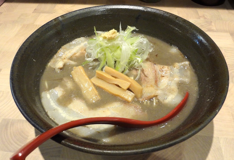 店の入口で食券を買い店内に入る。「にぼしらーめん88」の「88」は「はーぱー」と読む。お店の名前を考えた人は、バーボンが好きなのかな? 店内は男性一人と女性一人で切り盛りしている。ビールを飲んで寛いでいる3人組もいる。しばらくしてでてきたラーメンは見るからに煮干しカラーをしている。弘前は撫牛子のたかはしに似ているかな、と思ってしまった。煮干しの香りはやや弱めか。細ストレート麺だがそれでもスープがよく絡む。煮干しを使う量が多いのでスープの濃度が濃い高いのだろう。(2019/06)