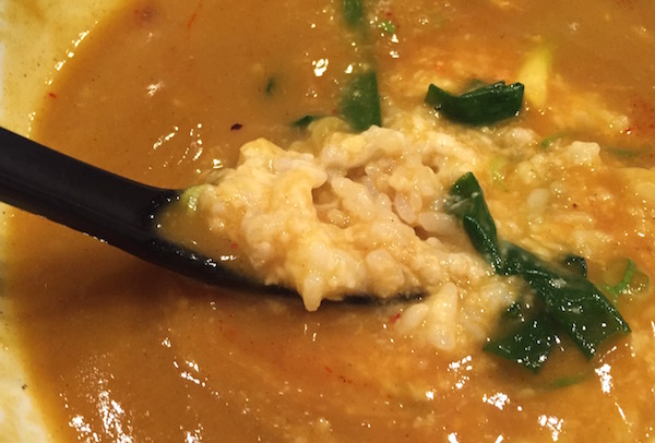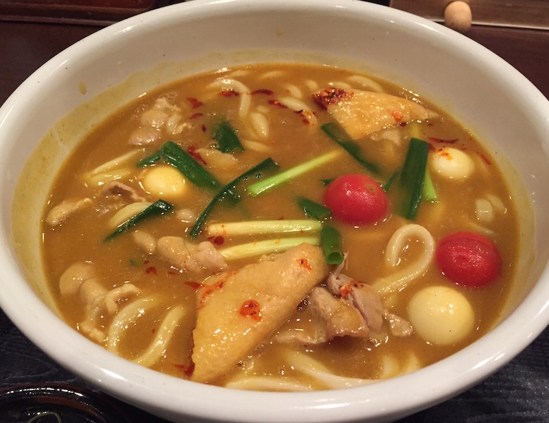 具だくさんのカレーうどんだ。うずらの卵、ミニトマト、長ネギ、豚肉などなどなど。うどんを食べ進むと、うどんの下に隠れてトロロご飯が!カレーうどんのルーに絡めて食べた。オジサンにはかなりヘビーな一杯だ。(2015/11)