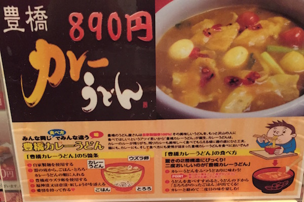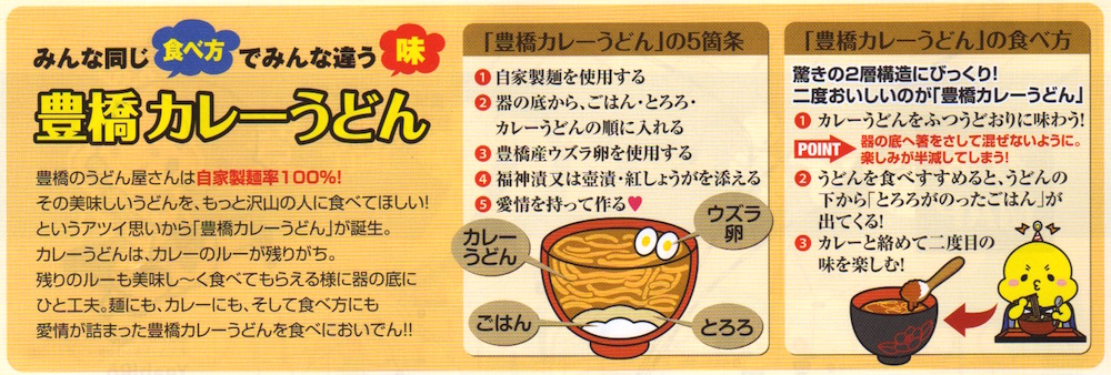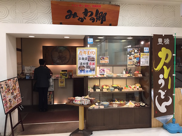 豊橋駅の観光案内所で聞き込み。「駅の近くで豊橋カレーうどんの美味しいお店を教えてください」と尋ねると、おじさんが「わたしゃ駅ビルのみかわの郷がうまいと思うが」といいながら、場所を教えてくれた。観光案内所から徒歩1-2分で着いた。店内に入りカウンター席に座り、「カレーうどんください」と注文すると、「豊橋カレーうどんですね」と確認された。後でメニューを見ると、「カレー南蛮うどん」もあった。なるほど。紙エプロンを装着し準備万端。そこへ豊橋カレーうどんが登場!