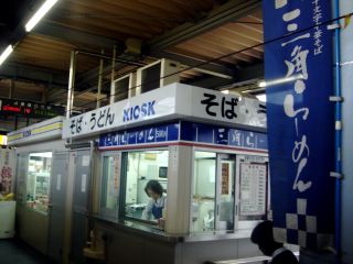 駅のホームの立ち食いそばやであるが、さすが秋田だけあり「十文字中華そば 三角ラーメン」があった。おそらく十文字に本店のある“名代三角そばや”の関連店であろう。“三角”だから“3番線”でもないのだろうななどバカなことを考えながら列車待ちの間に利用する。おばちゃんに声をかけると反対側にある券売機で食券を買うように促された。食券を渡すと、麺をデポに入れて茹で始めたと同時に、ビニール袋入りのスープの温めはじめた。