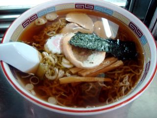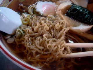 たちまちに出てきたラーメンは、スープは昆布を中心とした和風だし。イワシの焼き干しも入っているらしい。麺は極細の手打ち縮れ麺で、ピロピロしており喉ごしがよい。具は、チャーシュー・メンマ・のり・お麩・なると・ネギ。お麩が入るのが十文字ラーメンらしいところだ。(2006.10.06)
