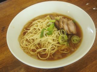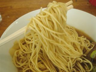 出てきた肉そばは誠にシンプルである。ネギとチャーシューしかない。そしてスープの量は少ない。チャーシューを半分妻の丼に載せて、二人とも同じラーメンになった。スープは、魚介系(煮干しと昆布中心?)ベースの飲みやすいもの。「化学調味料」は無添加であることが店内に堂々と掲示されている。麺は中ストレートで硬めに茹でられていて、小麦の美味しさを味わうことのできる麺である。ラーメン好きにとっては聖地の一つに来たという感傷に浸った。(2009/8/6)