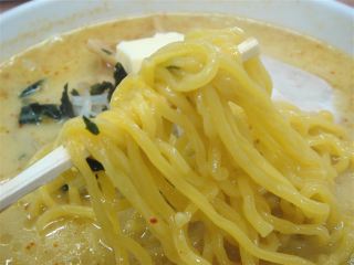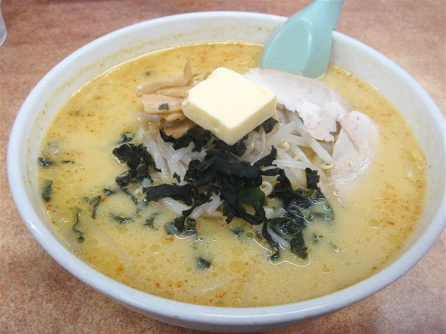 それほど待たずに出てきたラーメンは、ビジュアルは白味噌ラーメンといった感じ。物凄くインパクトがあるイメージだったが、とても食べやすい。途中からバターを溶いてみたり、ニンニクを追加したりして味の変化を楽しむ。麺は、黄色い太縮れでいわゆる札幌ラーメン。具は、チャーシュー(2)・メンマ・もやし・わかめ・バター。(2011/11)