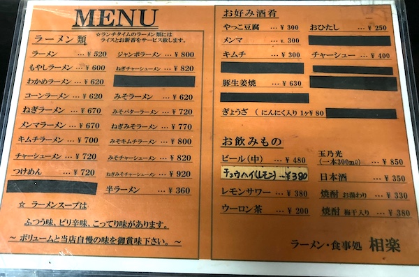 バスセンターの裏にひっそりとある相楽。ラーメンと食事処と書いてある。もやしラーメンを注文。あんけかでサンマーメン風を予想していたが、あんかけではなく、予想が外れた。中ちぢれ麺に甘めのスープ、たっぷりのもやしを堪能した。(2023/10)