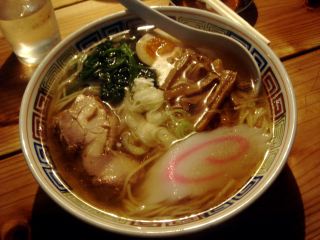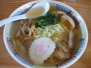 スープは魚系が前面に出たあっさりとした醤油味。麺は太平縮れ麺でモチモチして美味しい。具は、チャーシュー・メンマ・ほうれん草・なると(大)・味玉子(1)・ネギである。偶然に店内であった友人によると、平塚の味の味噌一と使っている器が似ているらしい。