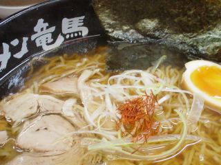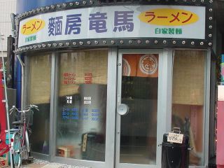 2004年12月の開店。昔の吉本家の場所。店内には製麺機がおいてあり、席はカウンターのみ。券売機を前にしてあーじゃないこーじゃないなどと言いながら、なかなか注文が決まらない大人6人組がいた。かといって、一人の私に「お先にどうぞ」などと宣う雰囲気もあるはずがない。やっとのことで竜馬ラーメンの食券を買う。ちなみにメニューは竜馬ラーメン600、特製ラーメン(岩のり)700、チャーシューメン800など。店内には先ほどの6人組を入れて7人のお客さん。一人はすでにラーメンを食べている。ここでチョットいやな予感が。どうも1ロット3杯づつで、3ロット目になってしまったのである。約束の時刻が着々と近づいているのだ(結局わずか1分の遅刻で済んだ)。まぁこちらの都合なのだけれど。