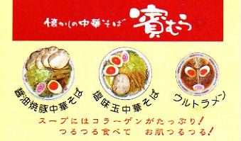 秋葉原にあった「賓むら」が、厚木に移転してきたようです。2007年11月頃の開店です。麺や食堂と道路をはさんだ場所にあります。駐車場はありませんが、近くの小田急線高架下の駐車場に停めて駐車券を見せると100円(30分間)のキャッシュバックがあります。メニューは、醤油中華そば650、醤油味玉中華そば750、醤油焼豚中華そば、塩中華そば700、塩味玉中華そば800、塩焼豚中華そば、ウルトラメン(子供用)400円など。ウルトラメンは、ラーメン自体がウルトラマンの顔のようになっているおもしろいもの。お店の名刺に描いてあります(上記参照)。券売機で左上にある基本メニューと思われる醤油中華そばの食券を買いました。店内には昭和30年代の本厚木駅近辺の写真が飾られています。それによると厚木にも昭和30年代前半まで七夕祭りがあったのですね。平塚の七夕に押されて、徐々に衰退していったようです。さて、カウンター席に座るとお冷と同時に、子供の駄菓子などが提供された。駄菓子は遠慮しておいたが、柿の種の小袋を一ついただいた。それにポイントカード。中華そば5杯食べると、1杯無料になるという優れ物。すでに印が一つ押してあった。