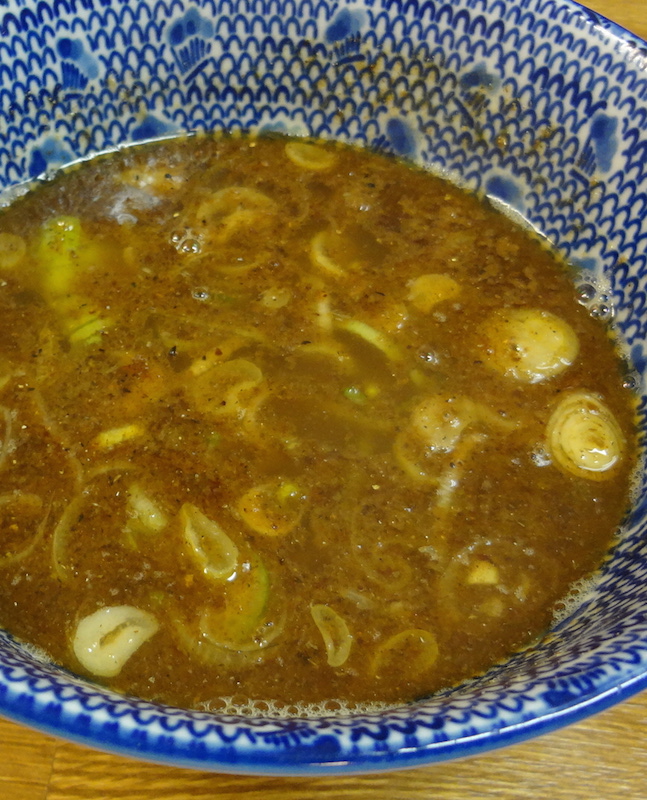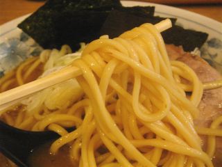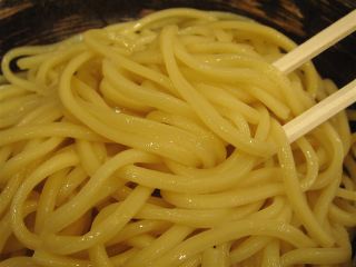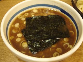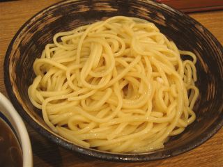 若い男性の店員2人の応対も元気がよく気持ち良い。しばらくしてでてきたもりそばは、いきなりかつお節の香りがパンチを利かせてくる。動物系で油の多めのつけ汁は、極太麺にも負けていない。自分にとってはやや酸味が足りなかったので途中で酢を入れて好みの味に整えて食べた。具は、チャーシュー・メンマ・のり・ネギ。スープ割りはポットに準備されていて自分で量を調整できる。(2008/8/29)