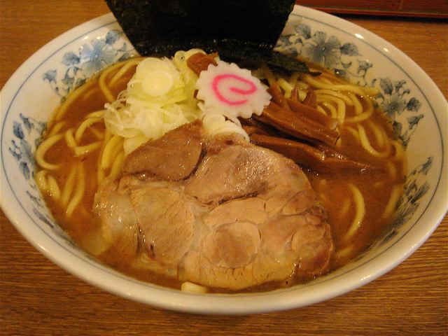 ちょっと待ってから中華そばが運ばれてきた。スープは魚介ダシの利いたも の。途中で酢を入れたり、辛みを入れたりしていろいろな味を楽しむことがで きる。麺は中太ストレートで、スープに負けないしっかりとしたものだ。具は、 チャーシュー・メンマ・のり・なると・ネギ。(2010/10)