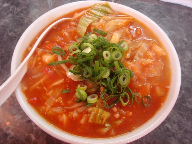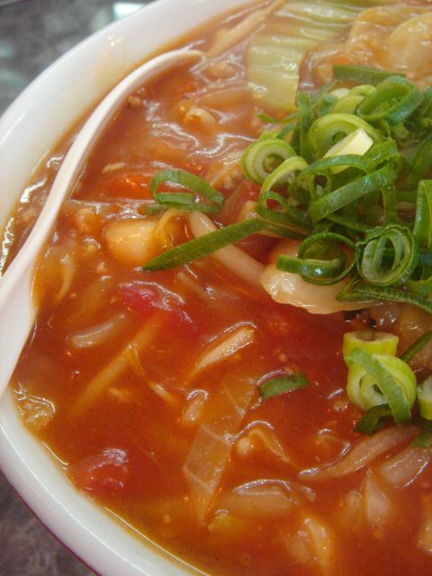 出てきたトマトたんめんは、背が高く逆円錐形の丼に入っていた。見た目は赤。でもトマトの赤なので辛くはないだろう。奥さんらしき女性が「熱いので気をつけてください」とひと言添えてカウンターにおいてくれた。スープは豚骨ベースでかなり濃厚である。トマトの酸味・甘みが妙に美味しい。麺は太めでスープの濃厚さにマッチしている。具は野菜と挽肉がタップリはいったトロミがスープの上に大量に乗っている。(2011/5)