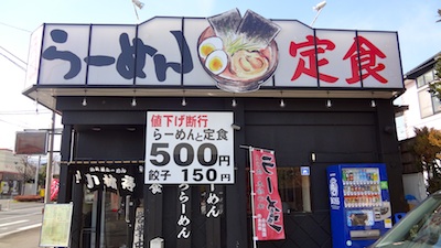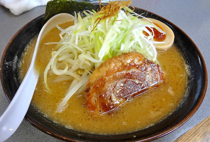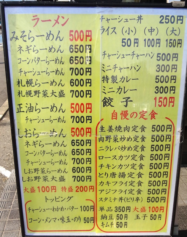 小林屋に定食メニューを加えたスタイルで、500円のメニューが多いのが特徴。北海道だけにみそラーメンの食券を買う。カウンター席に座ると比較的早くラーメンが出てきた。スープは濃厚だけれど甘みのある味噌。麺は黄色い縮れ麺。具のチャーシューは厚めでしっかりと味がついている。(2013/2)