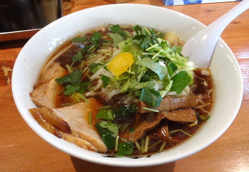 高校のOB会の前に寄る。今年の3月に開店した小田原系のお店。メニューは、ラーメン750、メンマラーメン850、ワンタンメン900、チャーシューメン1100、チャーシューワンタンメン1200、ミニチャーシュー丼300、ミニチャーマヨ丼300、大盛+100など。初めてなのでラーメンの食券を購入。カウンター席に着くと、「期間限定でゆずを香りづけに乗せていますがいかがしますか?」と聞かれたのでお願いした。また「ランチタイムなのでライスもつけることができますがどうしますか?」と聞かれたのでこちらは断った。