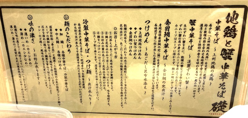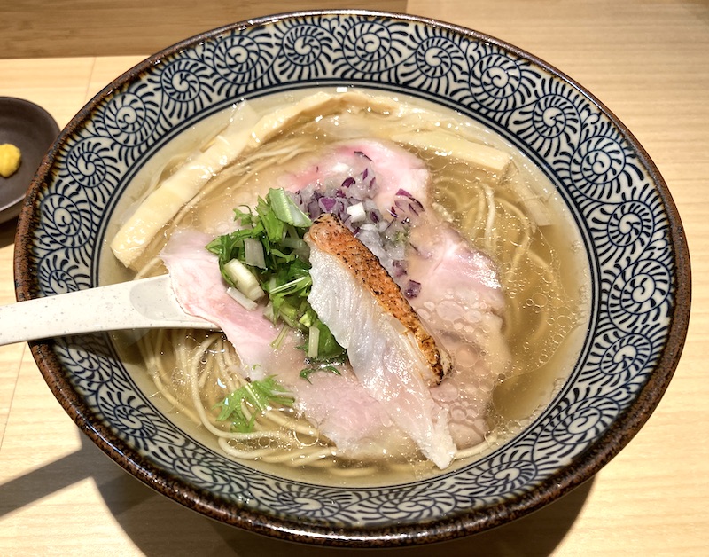 今月に開店したお店。某会社の一文字系のラーメン店らしい。上州地鶏、ずわい蟹、金目鯛、あごだしつけ麺など種々の味が楽しめる。迷うところだが金目鯛中華そばの食券を買い、店の外でしばし待つ。カウンターに案内され、しばらくしてからラーメン登場。ビジュアルは美味しそうだ。金目鯛のダシが弱いように感じたが、私の舌が贅沢なのかもしれない。(2024/3)