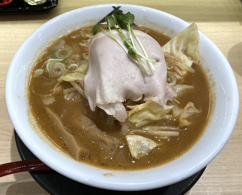 麺や食堂の別ブランドの味噌専門のお店。店内の券売機で味噌ラーメンの食券を購入。カウンター席に案内され「ご飯無料サービスですがいかがいたしますか?」と聞かれた。ご飯は遠慮しておこう。すぐにラーメン登場。油は少ないが濃厚なみそ味。麺はスープに負けないしっかりとした中太ストレート。具は野菜、もやしひき肉炒め、メンマ、チャーシュー。一味、山椒、胡麻で味変することができる。口直しに黒ウーロン茶が出てくるなんて、洒落ている。店を出る時にバイトの女の子が「楽しい夜を」と言ってくれたが、これからは家に帰るだけだ。(2024/4)