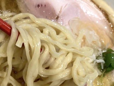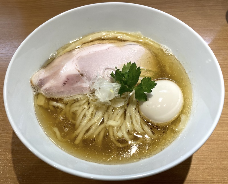 しばらくして出てきたらーめんは、ビジュアルが美しい。スープは煮干しが程よく上品に、だけど主張も忘れない。麺は平打ち麺でスープを絡めている。具はチャーシューが2種類。豚ロースと写真ではわからないが鶏の柔らかいササミ風の肉も入っている。その他には、穂先メンマ、ネギ、三つ葉など。もちろん味玉も。味玉は半熟で美味であった。(2024/5)