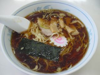 駅前大衆食堂のラーメン。写真でご覧のようにスープの色は醤油色というよりも黒色に近い。麺は中やや縮れ麺。具は、メンマ・チャーシュー・のり・なると・ネギ。(2005.3.21)