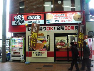 福井駅に到着したのは、定刻を1時間以上すぎた10時4分。他の特急列車も軒並み30-60分遅れていて、駅員はてんやわんやの大忙しだった。ところで九頭竜線は予定していた9時6分発の次の列車はなんと12時49分なのである。首都圏では全く考えられない時刻表である。2時間30分以上の時間があるので、えちぜん鉄道に乗ろうかどうか考えるが、雪の影響でえちぜん鉄道が全く遅れないとは断定できず、初志貫徹で九頭竜線に乗るべく時間をつぶすことにする。まずは福井で有名なソースカツ丼のチェーン店の小川家でソースカツ丼を食べる。こちらで言うと吉野家のような感じである。カツ丼のソースは酸味が強く、むせそうになってしまった。カツは薄くでサクサク食べることができる。(2008/02)