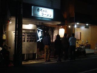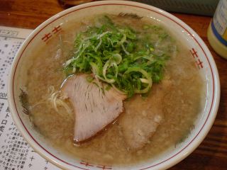 さてラーメンは油多めで豚骨濃厚のスープ。ゼラチン質の豊富な濃厚さである。麺は細ストレートで旨い。具は、チャーシュー(2)・ネギといたってシンプル。途中から生ニンニクをすって投入。さらに深みが増したようだ。食後の爪楊枝の先にはミントが塗ってあり、口の中がスッキリする。またウエットティッシュも完備されている。(2004/11/13)