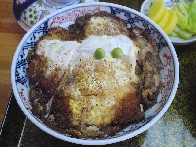 昭和23年創業のこのお店は営業時間が11時から14時と短く、夜は出前のみ行なっているようである。カウンター約12席、座敷に4人用卓袱台が3卓ある。幅の広いカウンターの隅に座り“元祖煮込ソースカツ丼850円”を注文する。ちなみにキャベツソースカツ丼850、中華そば500などのメニューもある。お客さんが多く15分ほどたってからカツ丼が運ばれてきた。 フタを開けると香ばしいソースの香りが漂う。まさに卵とじのソースカツ丼である。カツを食べるとソースの酸味が利いていてソース好きにはたまらない美味しさである。卵がある部分のカツはソース味が卵で和らげられていて酸味が少ない。肉自体も柔らかくて美味だ。まさしく地方独特の食文化である。 (2005/02)