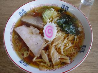 スープは、節系が香る甘めのシンプルな醤油味。麺は太い平麺で縮れている。食感はモチモチしていて美味しい。この麺が会津地方のラーメンの特徴なのだろうか? 具は、チャーシュー・メンマ・わかめ・なると・ネギ。チャーシューは食べごたえあり美味。(2005.2.13)