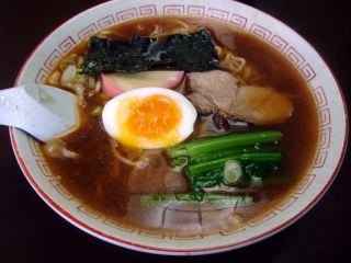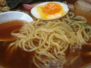 少し時間がかかって出てきたラーメンは、スープはそばのかえしをタレに使っているような、かつおの効いた和風のスープである。まさに正統派のそば屋のラーメンである。麺は中やや縮れでツルツルした食感である。具は、チャーシュー・かまぼこ・のり・半熟玉子(1/2)・ほうれん草・ネギ。(2006.12.24)
