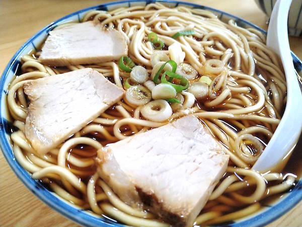[コメント]大正6年(1917年)創業の老舗。11時に到着したがすでに営業しており、店内は満員に近く最後のイスに座ることができた。常連率90%くらいかな、と思わせる雰囲気と店員と客との会話。さすが創業80年以上の貫録である。腰の曲がったおばあちゃんもいる。メニューは、中華そば300、ワンタン300のみ。中華そばを注文。