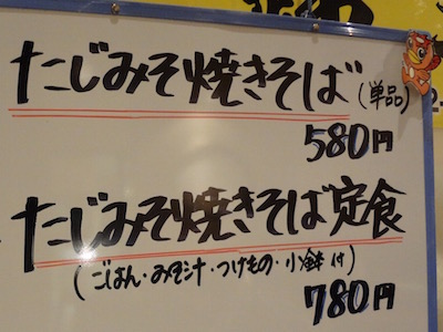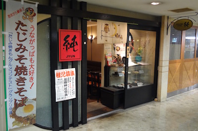 多治見駅前のショッピングセンターのテラの地下へ向かう。食料品売り場の奥に飲食店があり、その純という店で、たじみそ焼きそばを食べるのだ。テーブルにあったメニューにはお好み焼きと焼きそばの種類があるが「たじみそ焼きそば」という名前は見当たらない。店主に「たじみそ焼きそばを食べに来たのですが、、、」と尋ねると「あぁ、みそ焼きそばね」とあっさり言われ、壁を指差した。壁を見ると、ちゃ〜んと「たじみそ焼きそば」と書いてある。単品で注文した。特に変哲もない焼きそばなのだが、みそ味の焼きそばというのは確かに珍しいかもしれない。高校の先生が考案したそうだ。たじみそ焼きそばの定義としては(1)ピリ辛みそを使用した焼きそば、(2)半熟タマゴが乗っていることだけで、あとはお店によってアレンジされるようだ。(2016/9)