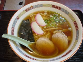 駅前にほど近い場所にある大衆食堂。メニューは学生ラーメン430、ラーメン500、玉子丼500、親子丼600、カツ丼700、カレーライス500、玉子丼セット(ラーメン+ミニ玉子丼)780、カツ丼セット(ラーメン+ミニカツ丼)830、ラーメンセット(ラーメン+おにぎり)650など多彩。ラーメンを注文。地元の常連客らしき人達が多い。ラーメンのスープは甘めの醤油味。麺は中縮れ麺で表面は滑らか。具は、チャーシュー・メンマ・のり・カマボコ・ネギ。(2005.4.10)