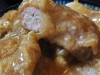 カツ丼・お新香・赤ダシ ◇ 肉のアップ