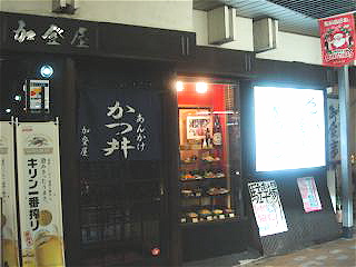 名古屋から中央本線を電車で約50分。瑞浪(みずなみ)駅に到着する。そこから徒歩1分のところに加登屋はある。入口の手前右側にはサンプルとともに、「名代加登屋のあんかけかつどん」という看板が誇らしげに掲げられている。入口のドアは寒冷地仕様の二重になっている。メニューを見ると「カツ丼」はあっても「あんかけカツ丼」の文字が見当たらない。お店の方に「あのー、あんかけカツ丼の評判を聞いて来たのですが」と言うと「はいわかりました。」と言うとともに厨房に向って「カツ丼一つ!」と声をかけた。なるほど“カツ丼”が“あんかけカツ丼”のことなんだ。